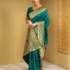 This exquisite bottle green Banarasi silk saree is an ideal choice for weddings, festive gatherings, and traditional celebrations. Crafted from premium silk, it showcases delicate antique gold zari buta motifs woven across the body, lending a rich and elegant appeal. The broad zari border adds a regal finish, while the intricately woven peacock motif pallu enhances its traditional charm. With a smooth texture and graceful drape, this saree offers both comfort and luxury. Style it with classic gold jewellery and a matching blouse for a timeless ethnic look that stands out beautifully.