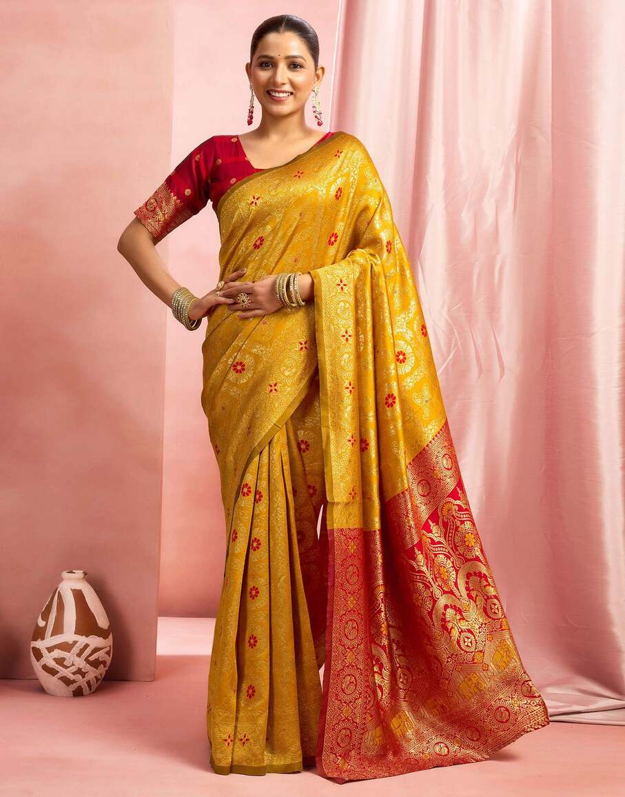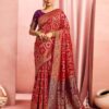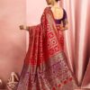 This rich crimson red Banarasi silk saree is a classic choice for weddings, festive occasions, and grand celebrations. Woven in luxurious silk, the saree features intricate gold zari motifs across the body that add depth and opulence. The contrasting purple zari border enhances its regal appeal, while the beautifully crafted elephant motif pallu brings a touch of royal heritage to the design. With its smooth texture and elegant drape, this saree offers both comfort and grandeur. Pair it with a purple blouse and statement gold jewellery for a striking, timeless ethnic look.
