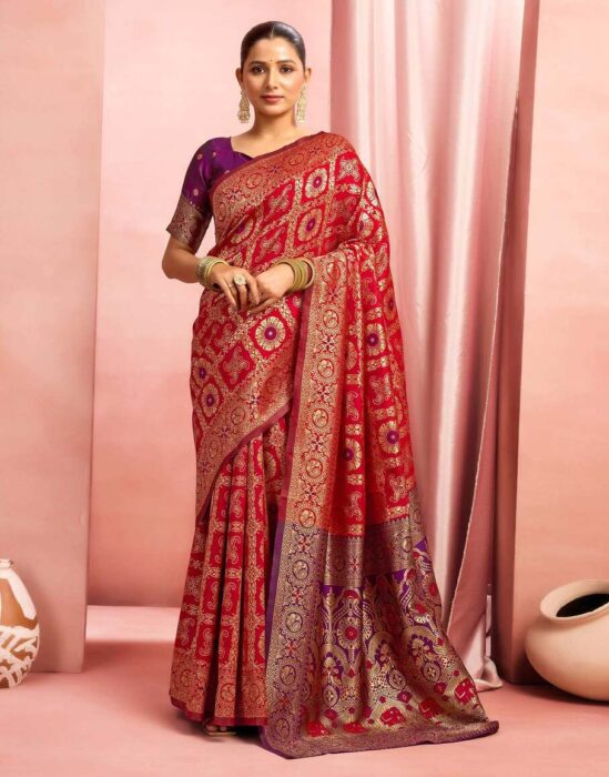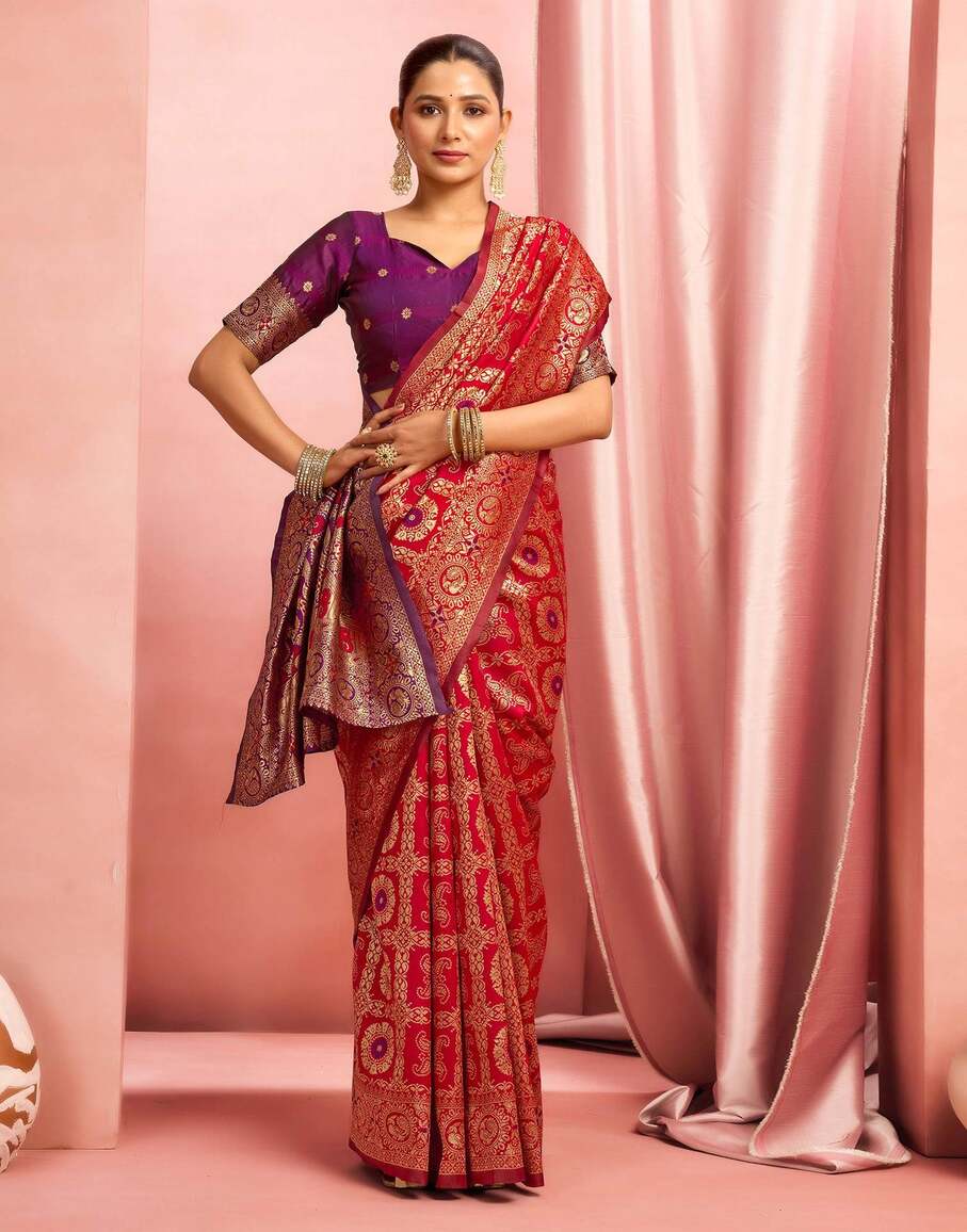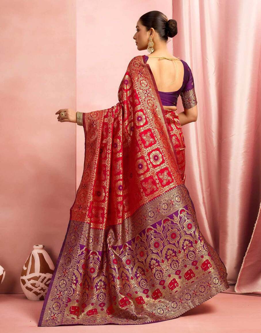 Crimson Red Banarasi Silk Saree with Purple Zari Border