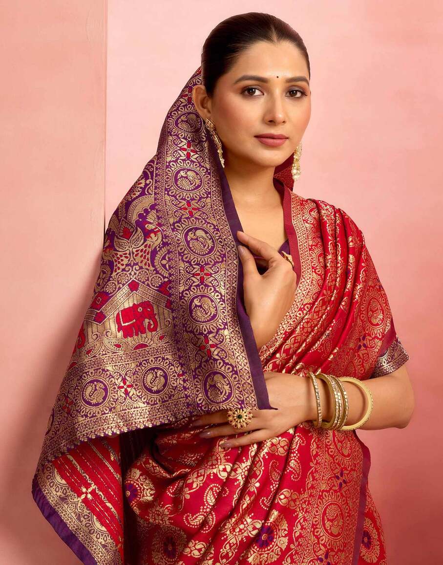 This rich crimson red Banarasi silk saree is a classic choice for weddings, festive occasions, and grand celebrations. Woven in luxurious silk, the saree features intricate gold zari motifs across the body that add depth and opulence. The contrasting purple zari border enhances its regal appeal, while the beautifully crafted elephant motif pallu brings a touch of royal heritage to the design. With its smooth texture and elegant drape, this saree offers both comfort and grandeur. Pair it with a purple blouse and statement gold jewellery for a striking, timeless ethnic look.