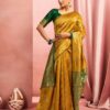 Be the first to review “Golden Yellow Banarasi Silk Saree with Deep Green Zari Pallu” Cancel reply