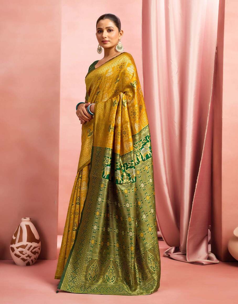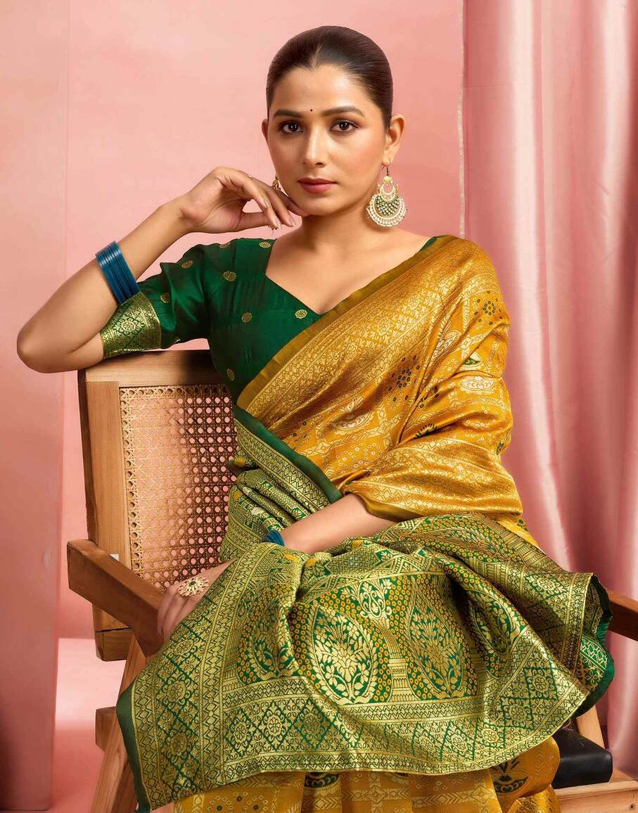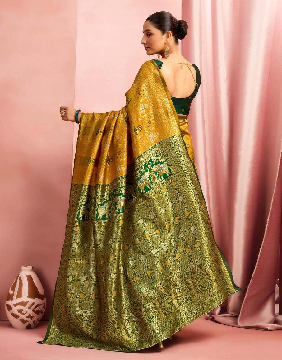 Golden Yellow Banarasi Silk Saree with Deep Green Zari Pallu