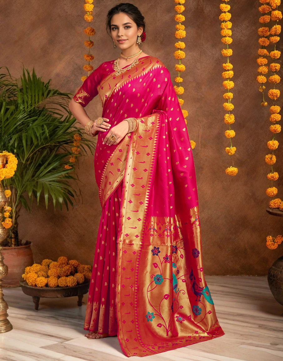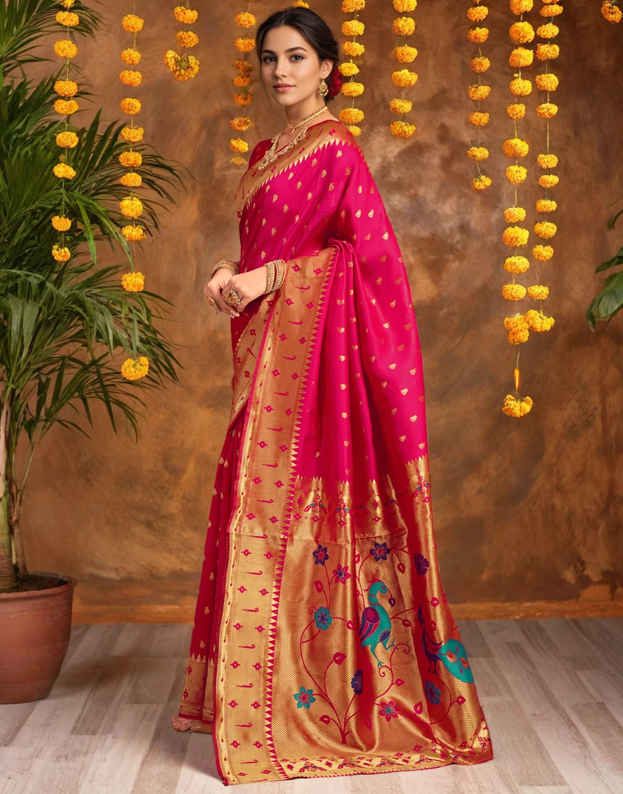 Rani Pink Banarasi Silk Saree with Antique Gold Zari Border