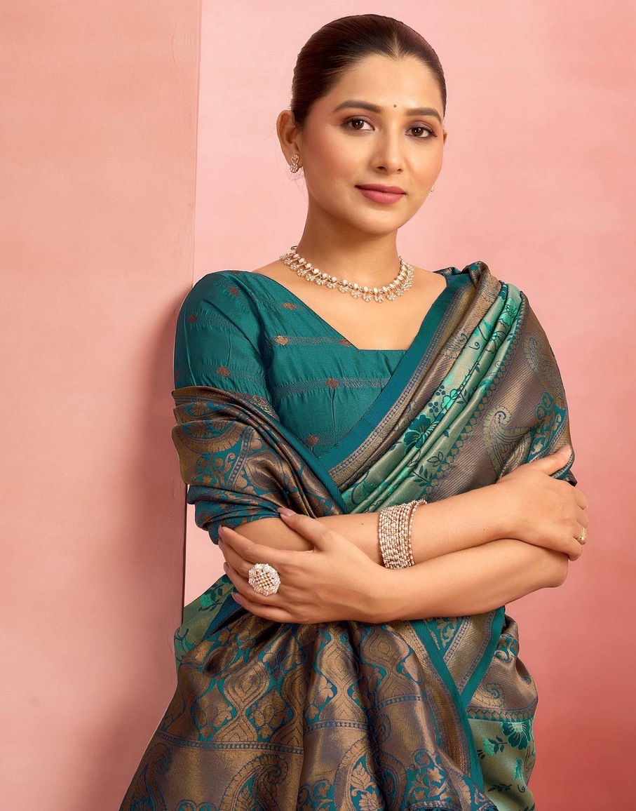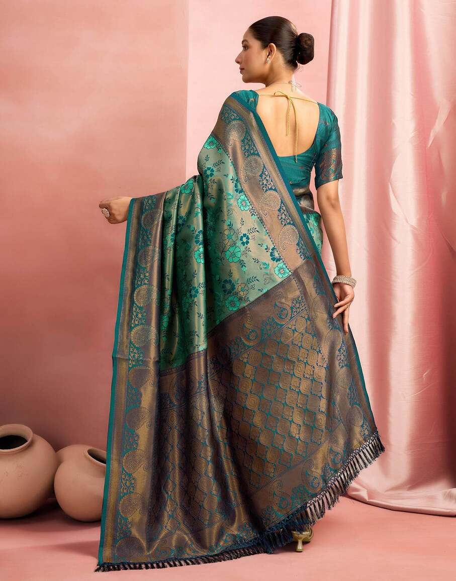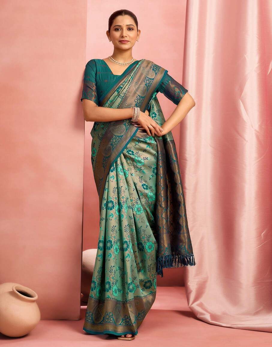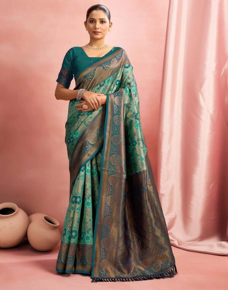 This elegant sea green Banarasi silk saree is a graceful pick for weddings, festive occasions, and traditional gatherings. Crafted from rich silk, the saree features finely woven floral motifs across the body that add a soft, refreshing charm. The antique gold zari border enhances its luxurious appeal, while the beautifully detailed pallu with traditional patterns brings a regal finish. With its smooth texture and fluid drape, this saree offers both comfort and sophistication. Pair it with a matching blouse and classic gold jewellery for a timeless ethnic look that stands out effortlessly.