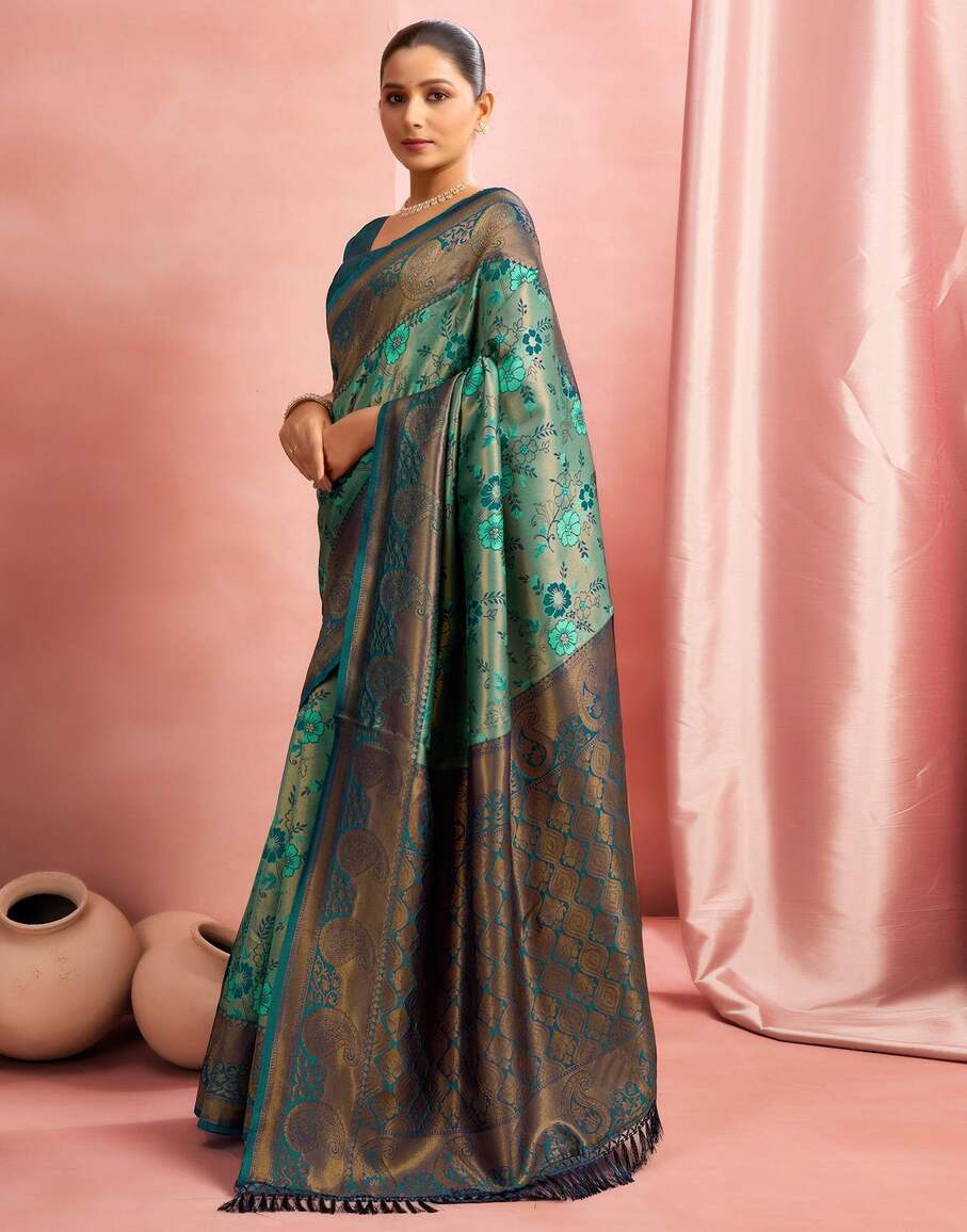 Sea Green Banarasi Silk Saree with Antique Gold Zari Border